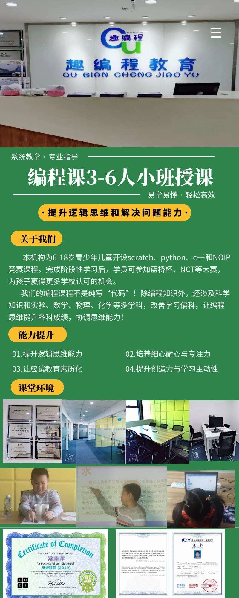 本機構(gòu)為6~18歲的青少年提供專業(yè)、科學的編程課程,現(xiàn)有編程啟蒙班、人工智能班和信息學競賽班,分別開設(shè)scratch、python、c++和NOIP競賽課程。